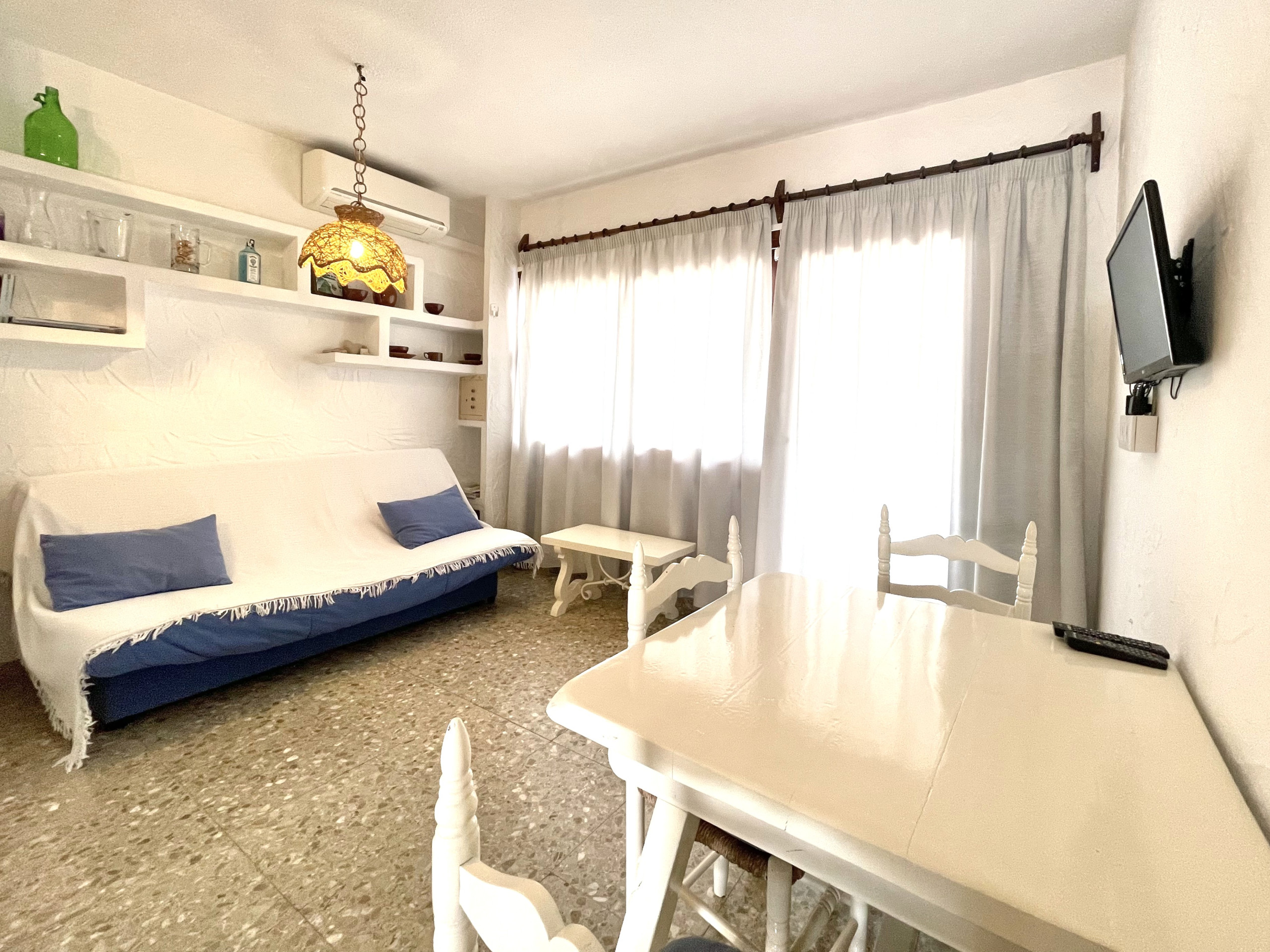 El apartamento dispone de un dormitorio doble con cama matrimonial (150 x 190) y ventilador al techo, baño completo, salón-comedor con sofá cama y aire acondicionado, Tv, Wi-Fi gratuito, cocina americana y balcón con mobiliario exterior.