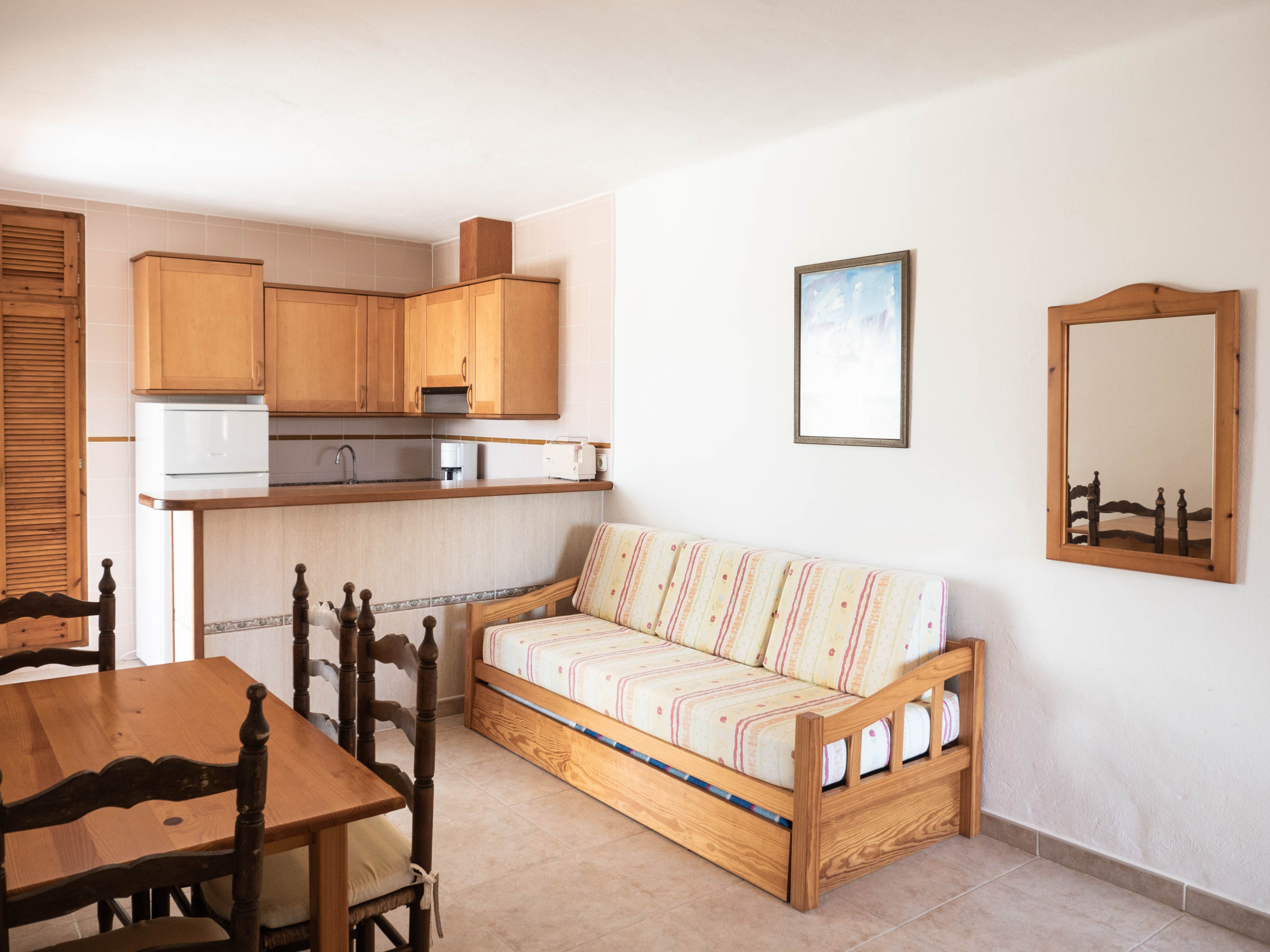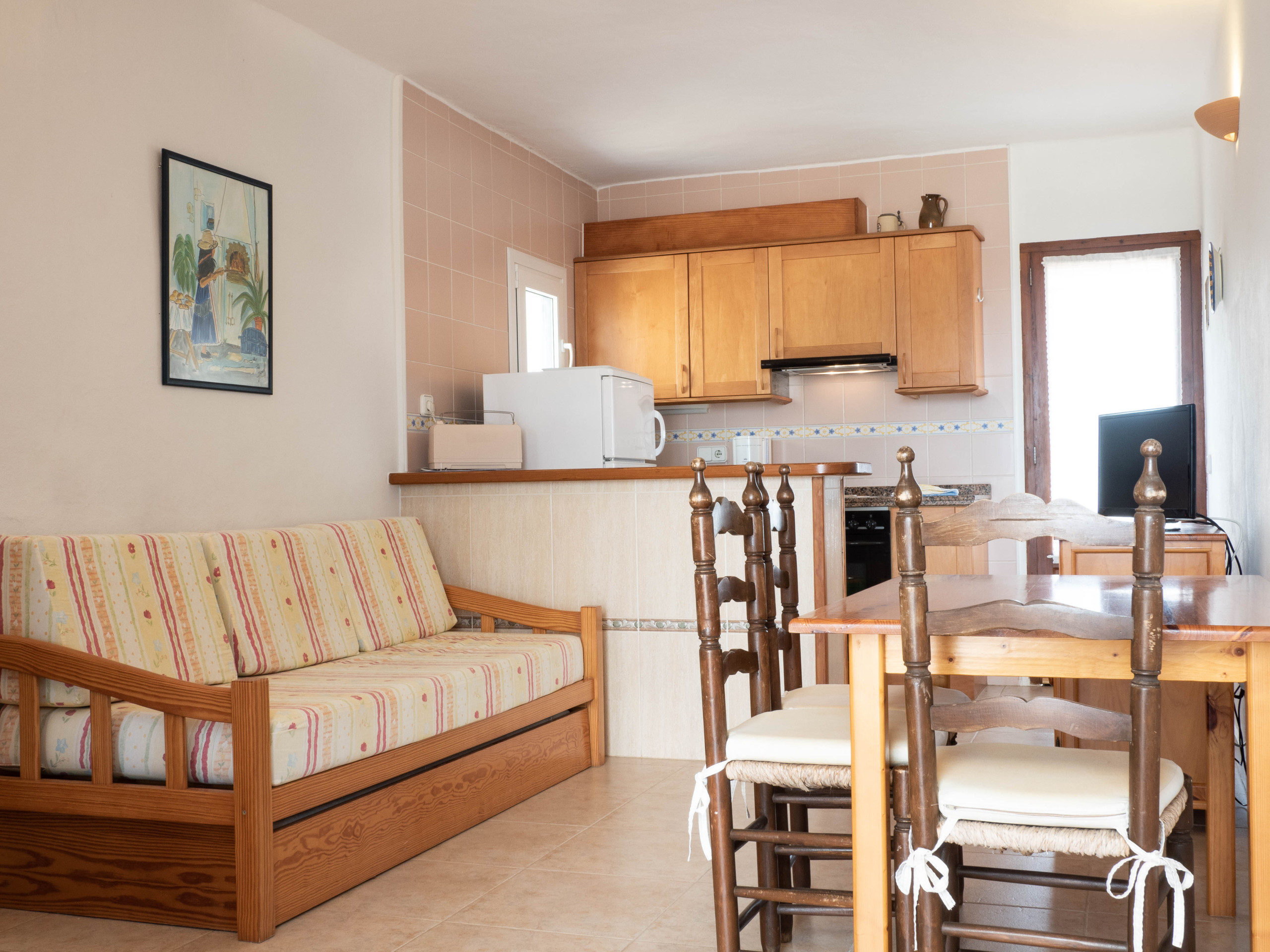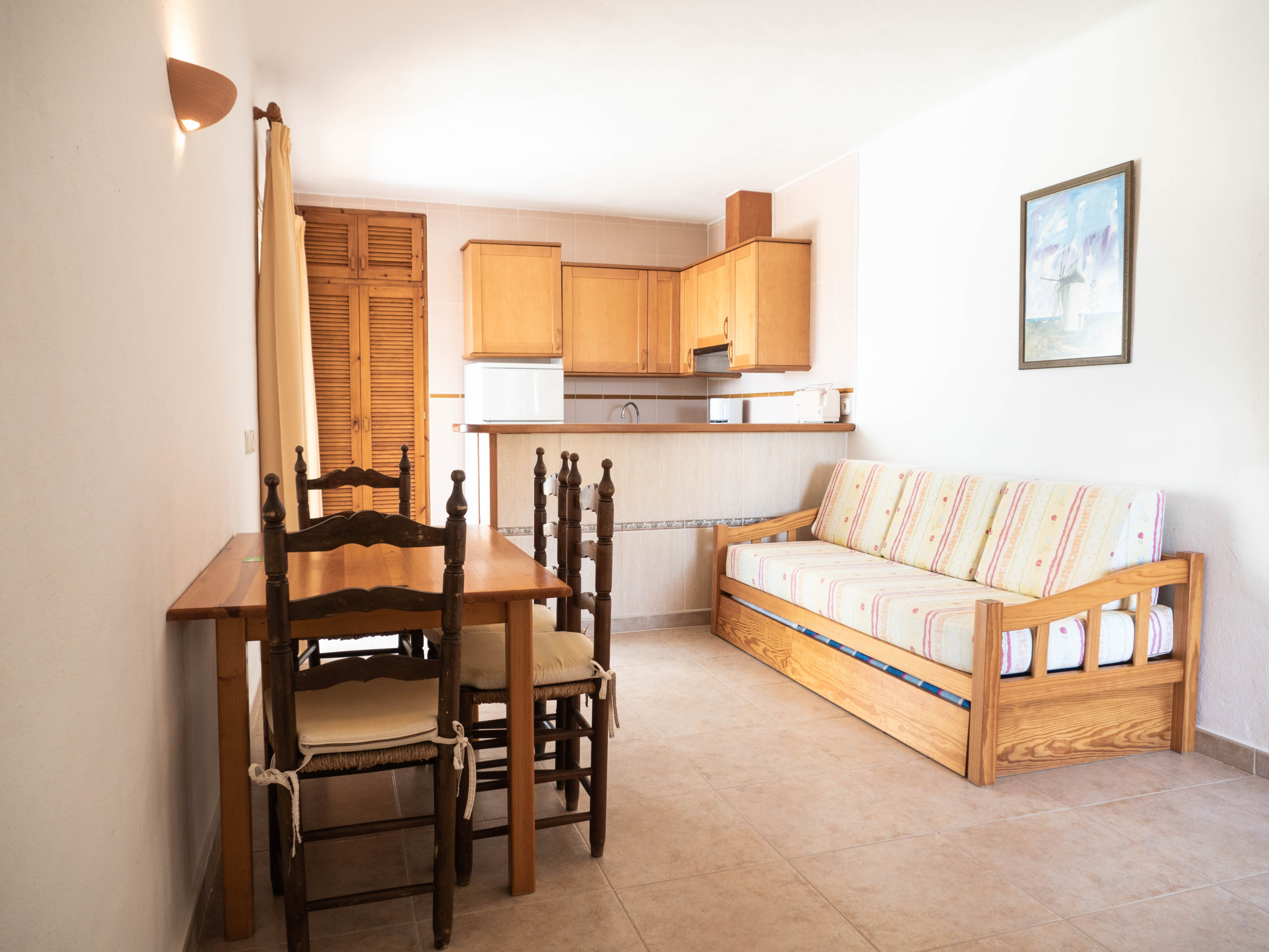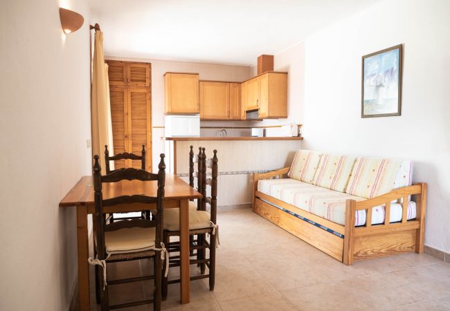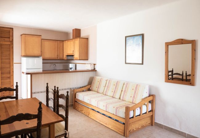 Situado frente a la piscina de S'Olivera, se compone de un dormitorio doble con dos camas individuales (90x190) y aire acondicionado, salón con cocina y sofá-cama, cocina, baño completo y terraza. Totalmente equipado con Smart-Tv, Wi-Fi, caja fuerte, secador de pelo, ventilador de techo y aire acondicionado.