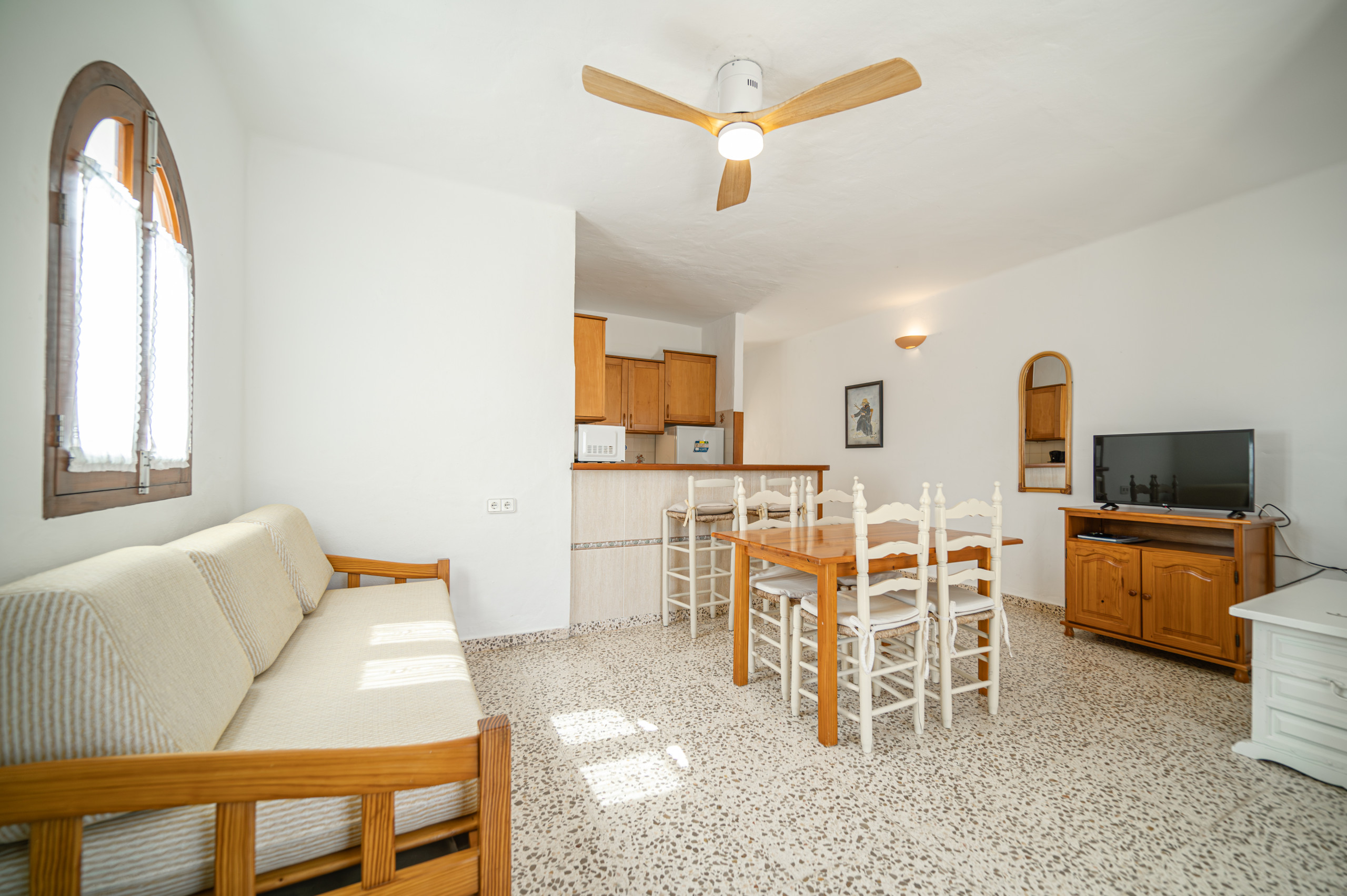 Se compone de un dormitorio con cama matrimonial (150x190) y aire acondicionado, salón con sofá-cama y ventilador de techo, Smart-Tv, Wi-Fi, cocina americana, baño completo y terraza.