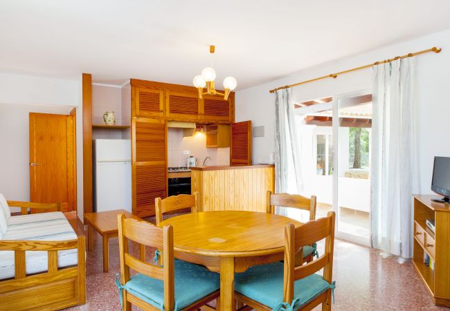 Bungalow en la planta baja del complejo S'Olivera situado en pleno oasis de tranquilidad a las afueras de Es Pujols, rodeado de árboles y en armonía con la naturaleza. A unos 150m del mar y a unos 400m del centro de Es Pujols.