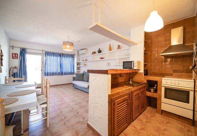 Located in front of the sea in the pedestrian promenade in the centre of Es Pujols. It is on the first floor of the Roca Plana building. It has one bedroom two single beds (90 x 190) and air conditioning, living room with sofa bed, Tv, Wi-Fi, kitchenette, bathroom and terrace with stunning sea views. The kitchen is well equipped with microwave, toaster, Italian coffee maker and/or filter, basic cooking and eating utensils, juicer, etc.