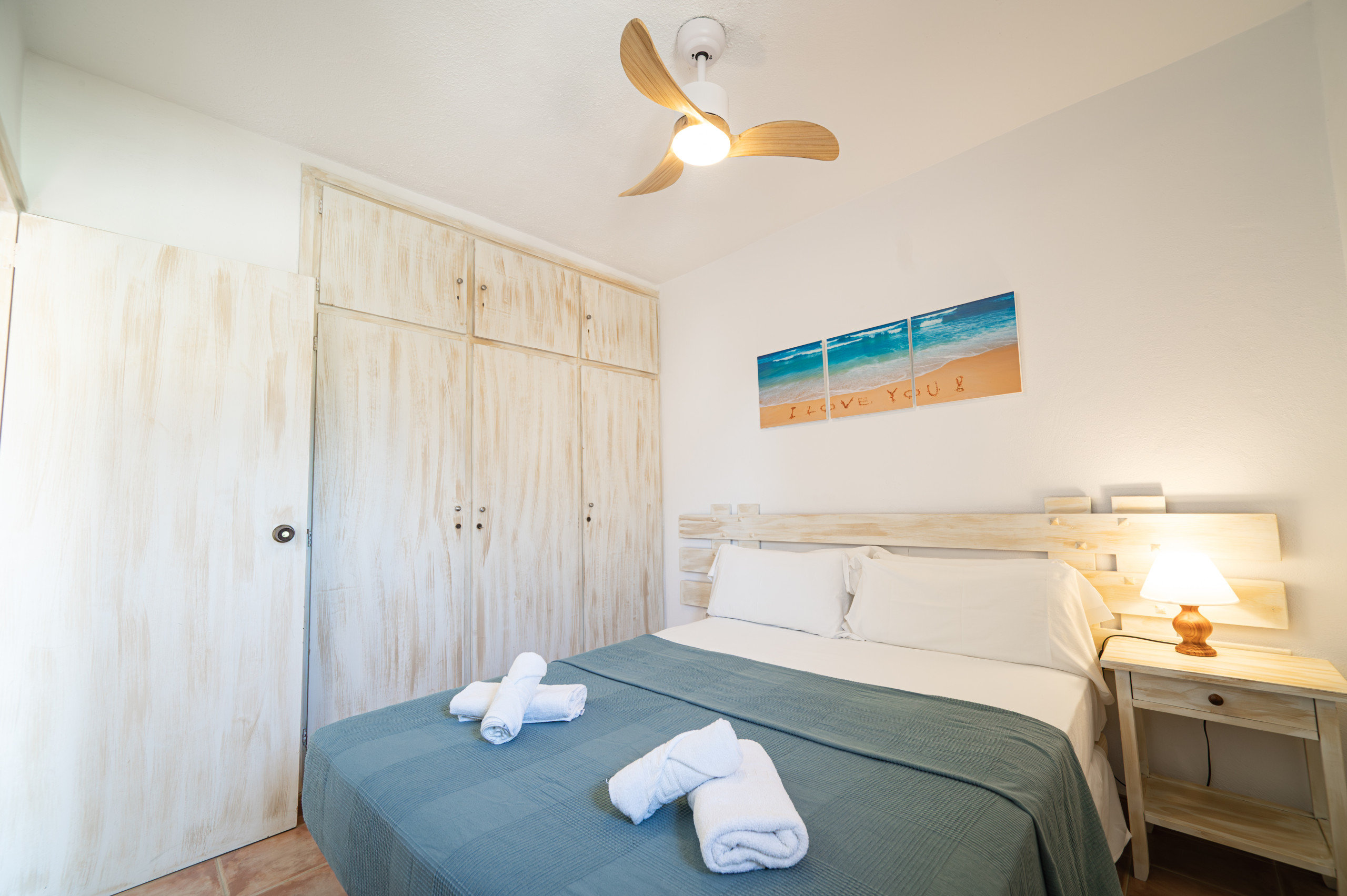 Appartamento situato al primo piano nello stesso edificio in cui si trova il nostro ufficio nel centro di Es Pujols, di fronte al supermercato La Alhacena e a circa 150 metri dalla spiaggia. È composto da una camera matrimoniale con due letti singoli (90x190) e ventilatore a soffitto, soggiorno con divano letto e aria condizionata, angolo cottura, bagno e balcone.